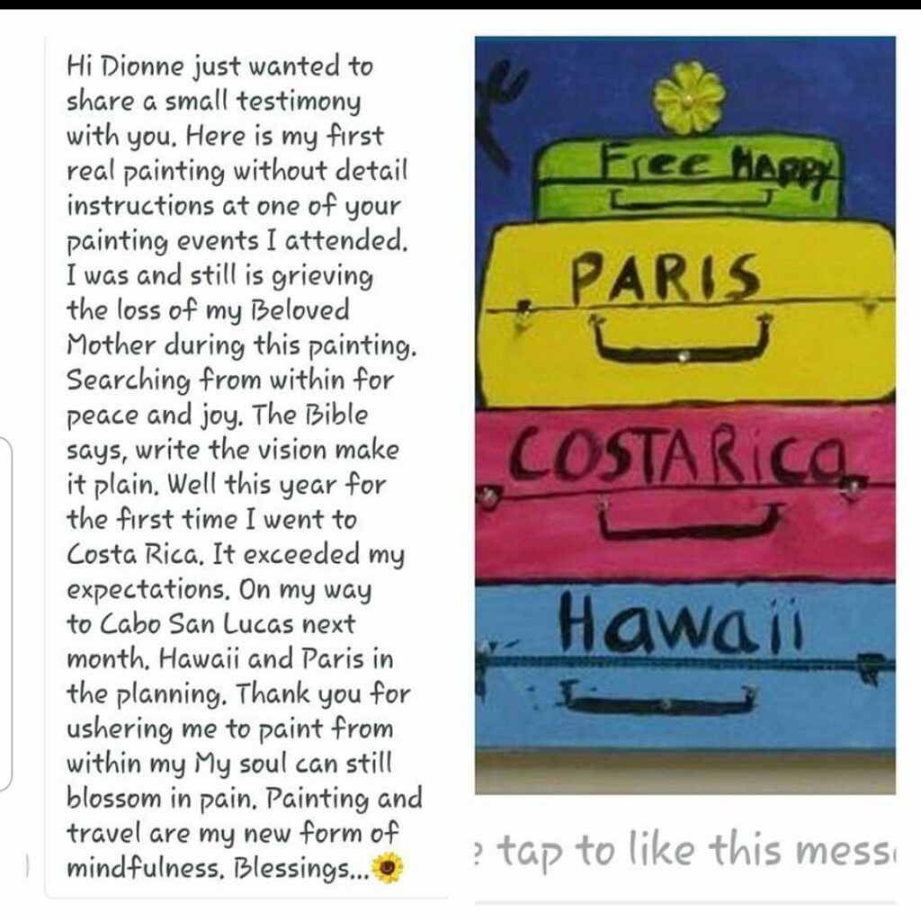 Dionne always brings her whole heart, her compassion, and her professionalism to the events she hosts. For the past five years, Dionne has been providing “Painting for Peace,” events for both participants and staff at Youth ALIVE! A violence prevention and intervention organization in Oakland California. The most impactful events Dionne hosts have been in support of our Khadafy Washington Project families. These are families who have lost loved ones to homicide. Participants of these events talk about the joy and healing Dionne’s events have given them, and they immediately start asking when they can attend another of Dionne’s “Painting for Peace,” events. I have had the privilege of knowing and working with Dionne for more than fifteen years and I cannot recommend her highly enough.